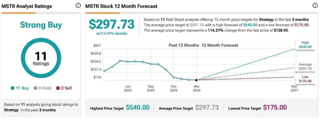 The MSTR stock is currently trading at $138.95, while Wall Street maintains an overall ‘Strong Buy’ consensus with price targets ranging from $175 to $540, citing TipRanks. Notably, no analyst over the past three months has rated Michael Saylor’s company a ‘Sell.’