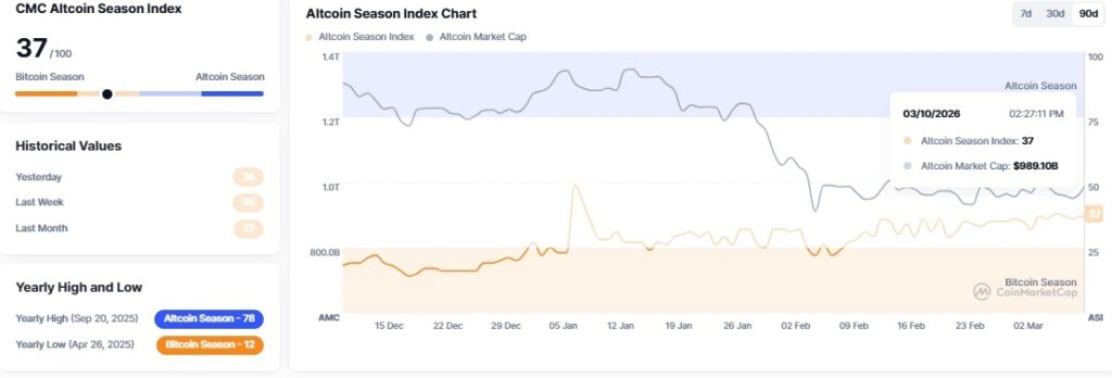 As such, the odds of altseason 2026 materializing in the coming months, akin to the 2021 crypto summer, have surged significantly. Moreover, the Altcoin Season Index has risen to 37/100 at press time from 22/100 at the beginning of February, based on data from CoinMarketCap.