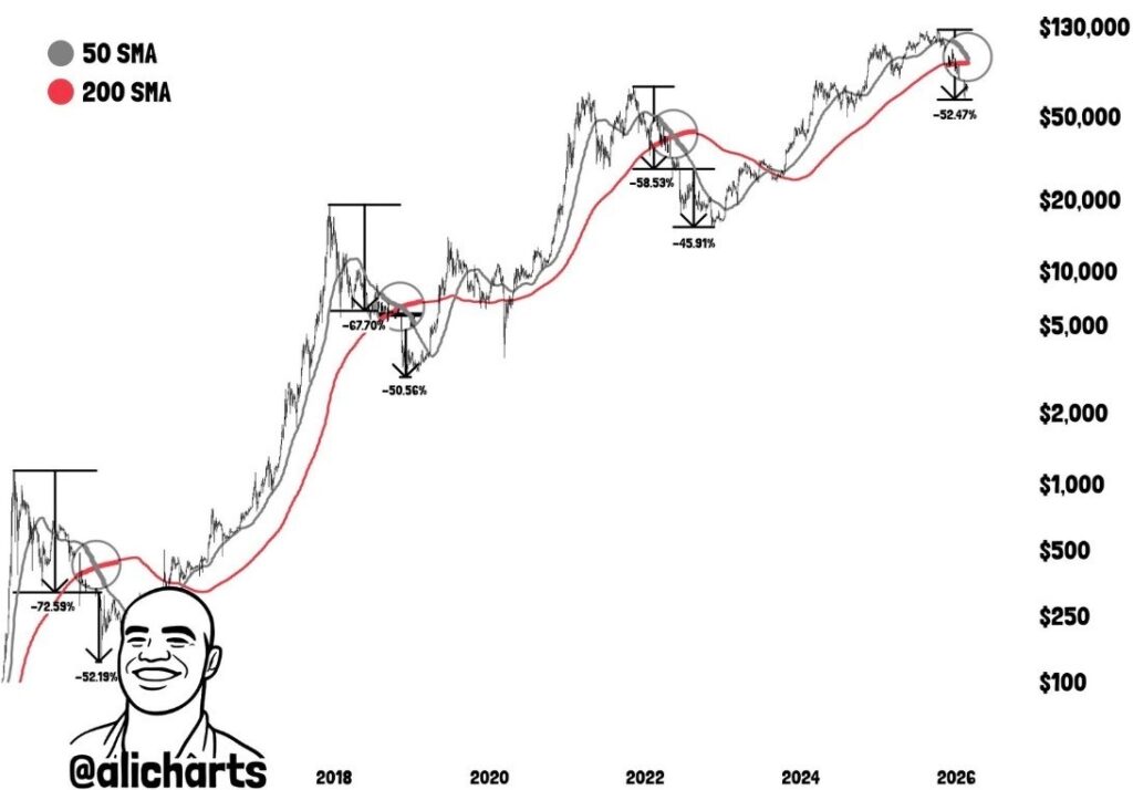 However, from a technical analysis standpoint, BTC’s price could crash further after the 50- and 200-day Simple Moving Averages (SMAs) recorded a death cross on the 3-day chart, according to analysis shared by trading expert Ali Martinez. Essentially, this is a historically bearish signal that, in prior cycles, has preceded further drawdowns before ultimate reversals.