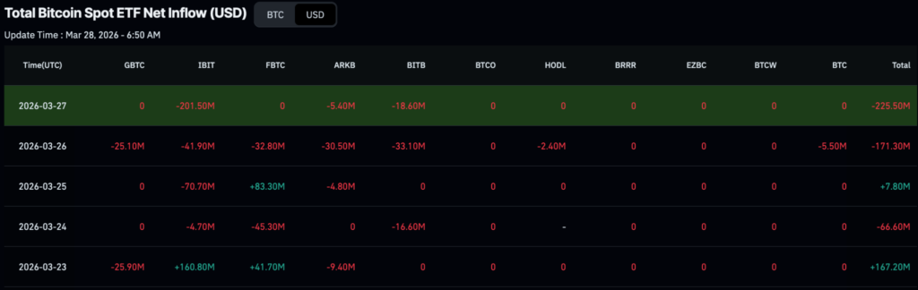 Selling pressure intensified toward the end of the week, with the largest single-day outflow of $201.5 million on March 27, effectively erasing earlier gains and driving the overall negative balance.