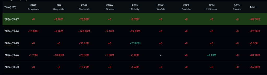 The largest single-day outflow occurred on March 26, when $140.2 million exited the fund. This was followed by another steep $70.8 million outflow on March 27. Earlier in the week, ETHA recorded losses of $33.4 million on March 25, $25 million on March 24, and $15.7 million on March 23, highlighting a sustained and accelerating withdrawal trend.