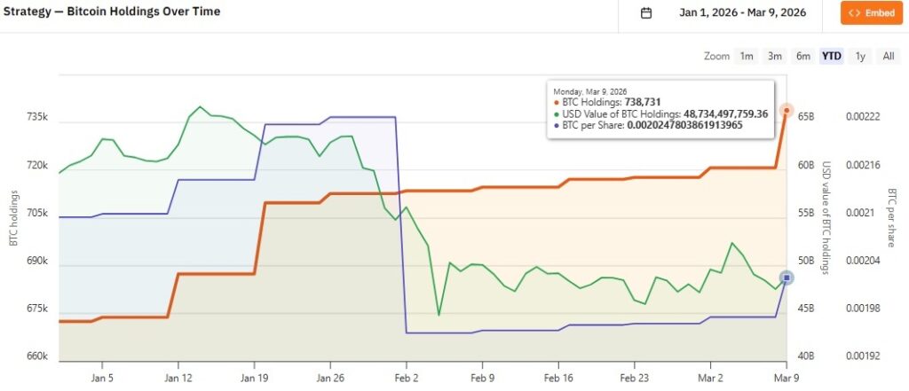 Strategy’s BTV holdings YTD. Source: BitcoinTreasuries