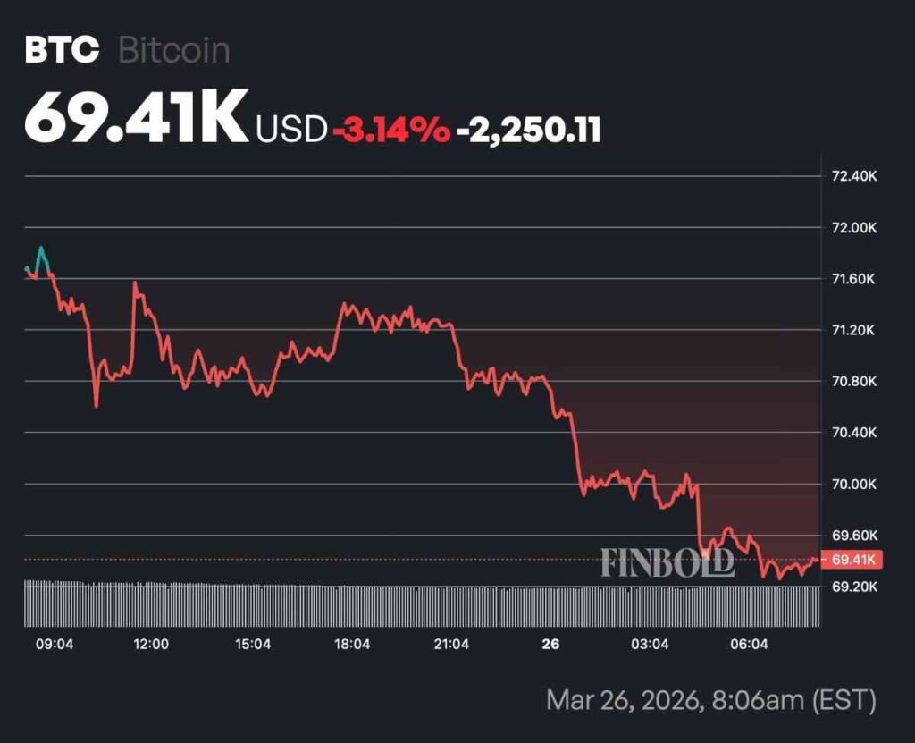 Despite the announcement, Bitcoin price pulled back 3.14% on the daily chart, trading at about $69,410, closely mirroring a broader market pullback of roughly 3.07%.