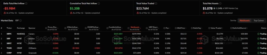 Spot XRP exchange-traded funds (ETFs) recorded another negative net outflow session on Monday, March 16.