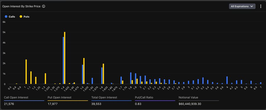 Such a large cluster often acts as a price magnet, as traders adjust positions into expiry. The $1.40 level could therefore serve as strong support, with price likely to gravitate toward it in the short term.